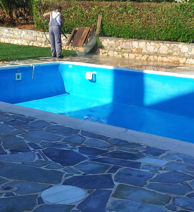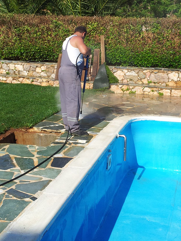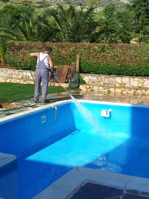 Καθαρισμός πισίνας και περιβάλλοντος χώρου. Τελική φάση όπου γίνεται ξεπλύσιμο
